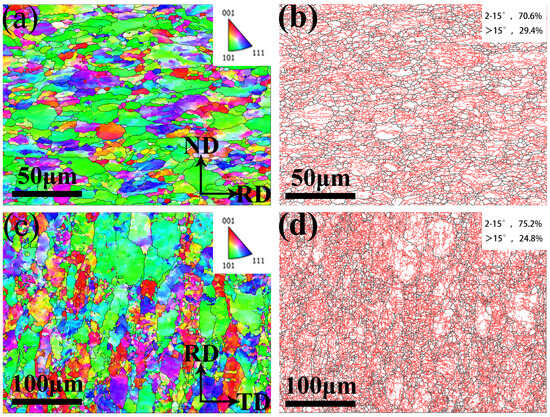EBSD of W-0.3% Hf samples. (a) EBSD orientation mapping of RD-ND surface. (b) Distribution of high-angel grain boundary (black) and low-angel grain boundary (red) of the RD-ND surface. (c) EBSD orientation mapping of RD-TD surface. (d) Distribution of high-angel grain boundary (black) and low-angel grain boundary (red) of the RD-TD surface.