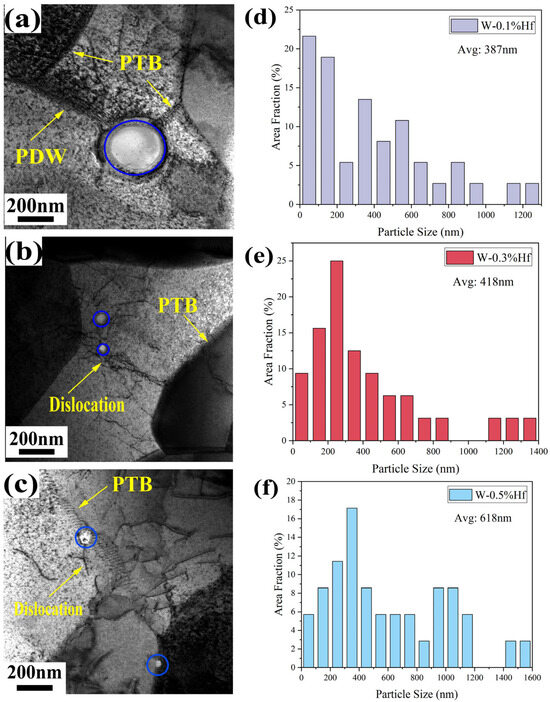(a–c) Second-phase nanoparticles (in the blue circle) tightly bound to the GBs, dislocations interacting with intragranular second-phase nanoparticles, and TEM images showing the formation of fine tungsten grain from PDWs transforming to PTBs during the hot rolling process. The size distribution fractions of the second-phase particles of (d). W-0.1% Hf, (e). W-0.3% Hf, and (f). W-0.5% Hf, respectively.