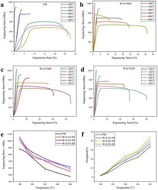 Engineering stress–strain curves of PW and W-Hf samples tested at different temperatures during tensile test. (a) PW samples; (b) W-0.1% Hf; (c) W-0.3% Hf; (d) W-0.5% Hf. (e) Summary of ultimate tensile strength (UTS) of different samples at different temperatures. (f) Summary of percentage elongation of different samples at different temperatures.