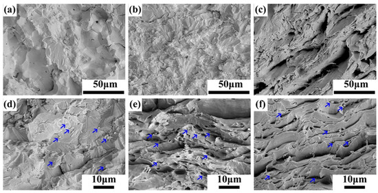 Microstructure of the tensile test fracture at different temperatures. (a) PW at 150 °C. (b) PW at 300 °C. (c) PW at 500 °C. (d) W-0.3 wt% Hf at 150 °C. (e) W-0.3 wt% Hf at 300 °C. (f) W-0.3 wt% Hf at 500 °C. The blue arrows in (d–f) indicate that the second-phase particles in the W-0.3% Hf alloy are distributed in the fracture.