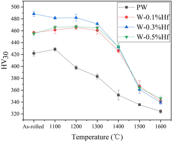 Figure 7 shows the change in the hardness of PW and W-Hf alloys in their original rolling state and after annealing at different temperatures for 1 h. For the PW, the Vickers hardness is 428.9 ± 3.00 HV30 after annealing at 1100 °C. This process releases the residual stress, and the hardness change is not significant compared with the original rolled sheet (421.93 ± 4.53 HV30). When the annealing temperature rises to 1200 °C, the hardness decreases sharply to 397.8 ± 3.36 HV30, indicating that the material has recrystallized. The decrease in hardness is due to the decrease in dislocation density during recrystallization, resulting in new grains without distortion [32]. Therefore, the recrystallization temperature of PW is determined to be 1200 °C. For W-Hf alloys, in the annealing temperature range of 1100–1300 °C, the hardness change curves of the three components all show a plateau period, and the Vickers hardness fluctuates slightly. However, when the annealing temperature was 1400 °C, the Vickers hardness of W-0.1% Hf decreased to 426.33 ± 3.18 HV30, the Vickers hardness of W-0.3% Hf decreased to 432.66 ± 5.48 HV30, and the Vickers hardness of W-0.5% Hf decreased to 433.36 ± 4.57 HV30. The hardness change curves all decreased sharply, indicating that the recrystallization temperature of W-Hf alloy samples was about 1400 °C. In this work, the amount of Hf added did not cause significant difference in the recrystallization temperature of W-Hf alloy. Compared with the rolled pure tungsten sample in the same preparation process, the recrystallization temperature of the W-Hf alloy sample increased by more than 200 °C.