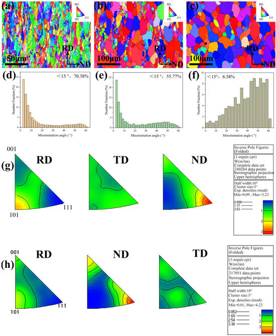 EBSD orientation maps of RD-ND surface after annealing at 1200 °C (a), 1400 °C (b), and 1600 °C (c) for 1 h. Grain boundary misorientation distribution maps after annealing at 1200 °C (d), 1400 °C (e), and 1600 °C (f) for 1 h. IPF after annealing at 1200 °C (g) and 1600 °C (h) for 1 h.