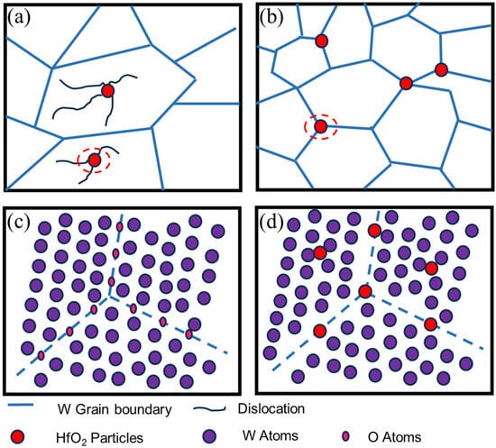 Schematic diagram of the effect of Hf addition. (a) Intragranular second-phase nanoparticles can pin and accumulate dislocations inside the grain. (b) Second-phase particles that are tightly bound to the GBs can impede GB sliding. (c) Impurity elements distributed at the grain boundaries of pure tungsten. (d) Formation process of second-phase particles of HfO2.