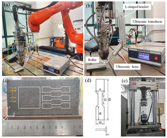 (a) LDED-UR device, (b) detailed structure of the ultrasonic rolling setup, (c) the manufactured thin-wall structure, (d) the size of the fatigue sample, and (e) fatigue testing machine.