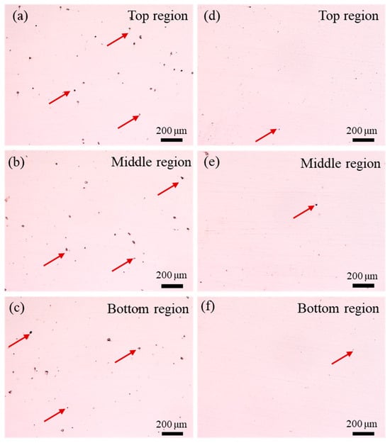 Figure 3 shows the porosity characteristics of the LDED and LDED-UR alloys across three representative regions. From Figure 3, it can be clearly seen that the fraction of pores is different for the two cases (LDED and LDED-UR). In the LDED alloy, a significant number of pores (marked by crimson arrows) are observed in Figure 3a–c, with an average size of about 34.1 μm. The appearance of these pores is primarily due to the instability of the melt pool [40,41]. When in situ ultrasonic rolling is applied to the LDED alloys, the pore fraction is dramatically decreased, as presented in Figure 3d–f. Meanwhile, the average size of pores decreases to about 10.2 μm after the application of in situ ultrasonic rolling. Archimedes density measurements were conducted to evaluate the density of the two alloys, and the results show that the density of the LDED and LDED-UR alloys is 98.26% and 99.27%, respectively. It can be summarized that both the fraction and size of pores are decreased in the LDED-UR alloy. This is attributed to the fact that the closure of pores is facilitated by the plastic deformation and metal flow induced by ultrasonic rolling.