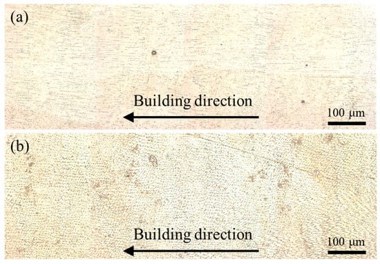 Figure 4 displays the grain morphology of the LDED and LDED-UR alloys along the building direction in the XZ section. From Figure 4a, it can be found that columnar dendrites form along the building direction when the alloy is deposited using LDED. The directional growth of grains along the [001] orientation during the laser-directed energy deposition process has been thoroughly discussed in our previous studies [42,43,44,45]. Meanwhile, the [001] orientation dendrites axes can be ascribed to the large temperature gradient and small crystal growth velocity. Note that the steep temperature gradients are mostly parallel to the building direction. In particular, the epitaxial growth of columnar microstructures is also correlated with the partially remelted grains of the previously deposited layer, which act as pre-nuclei for the directional growth of crystals. When the in situ ultrasonic rolling is applied, the fully equiaxed grains appear, as presented in Figure 4b. It is also indicated that the applied ultrasonic rolling effectively influences the entirety of the deposited layers.