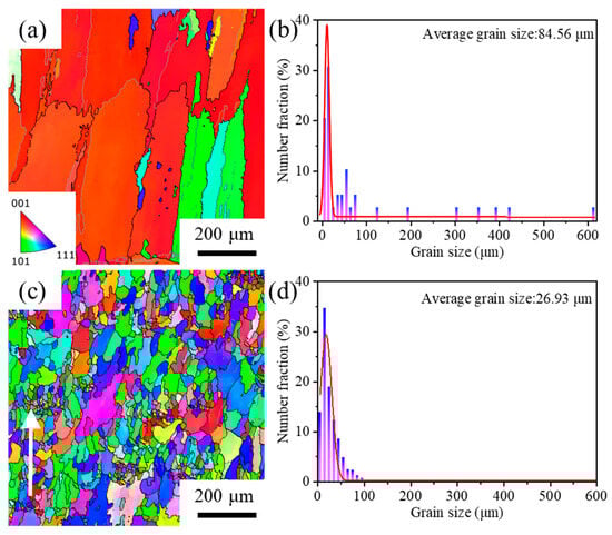 Inverse pole figure (a,c) and grain size distribution (b,d) of the LDED alloy (a,b) and LDED-UR alloy (c,d).