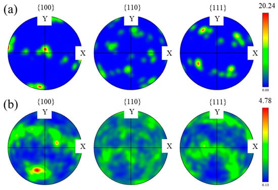 The pole figures are analyzed to discuss the microstructure anisotropy of two alloys. Figure 6 displays the pole figures in the {100}, {110}, and {111} orientations of two alloys. From Figure 6a, the maximum intensity of the pole figure is observed in the {100} orientation, with a value of 20.24. This is also can be found in the {100} orientation of the LDED-UR alloy (Figure 6b), where the maximum intensity is 4.78, significantly lower than that of the LDED alloy. The reduced maximum intensity of the pole figure for the LDED-UR alloys indicates that the microstructure anisotropy is substantially diminished in the LDED-UR alloy.