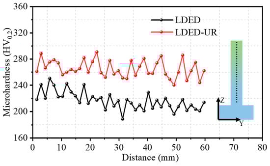The significantly distinct microstructure characterizations directly influence the mechanical properties of the LDED and LDED-UR alloys. In this paper, the mechanical properties of two samples are discussed in detail, and their underlying mechanisms are thoroughly investigated. Figure 7 presents the microhardness of the LDED and LDED-UR alloy along the building direction in the YZ plane. A total of 40 points were utilized to assess the microhardness of these two distinct samples. From Figure 7, it is evident that the microhardness variation along the deposition direction is minimal for both cases examined, suggesting a consistent distribution of microhardness throughout. The mean microhardness values for the LDED and LDED-UR samples are found to be 215.88 ± 11.83 HV0.2 and 264.78 ± 12.16 HV0.2, respectively. The enhanced microhardness in the LDED-UR sample can be attributed to the grain refinement induced by the in situ ultrasonic rolling process.