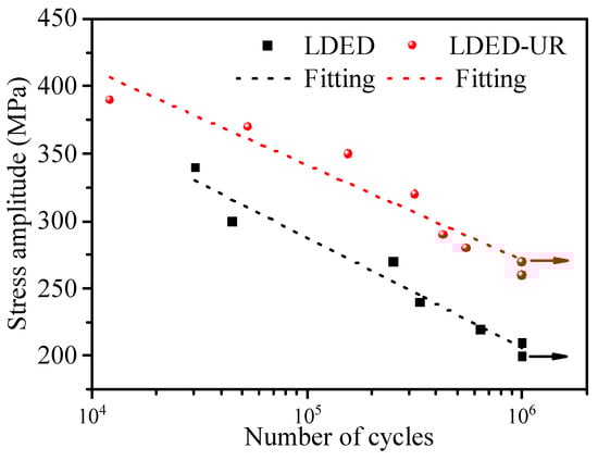 Figure 8 presents the results of the high-cycle fatigue (HCF) tests. Samples that withstood 106 cycles without failure were deliberately halted, considering this number of cycles as their endurance limit. To enhance the visualization of the high-cycle fatigue behavior across different sample categories, data points from each category were subjected to linear regression analysis. The parameters of these regression lines are outlined in Table 1. From Figure 8, it is evident that the fatigue lives of the two alloys increase with the decrease in the stress amplitude. This opposite trend can be attributed to the reduction of maximum stress at a given stress ratio, which results in a reduction in dislocation nucleation [47]. As a result, the initiation of fatigue crack is delayed. Moreover, it can also be seen from Figure 8 that the fatigue limit (at the fatigue life of 106 cycles) of the LDED alloy and the LDED-UR alloy are notably distinct. For the LDED alloy, the fatigue limit stands at 210 MPa. In contrast, for the LDED-UR alloy, the fatigue limit is considerably elevated to 270 MPa, marking an increase of 29% compared to the LDED alloy.