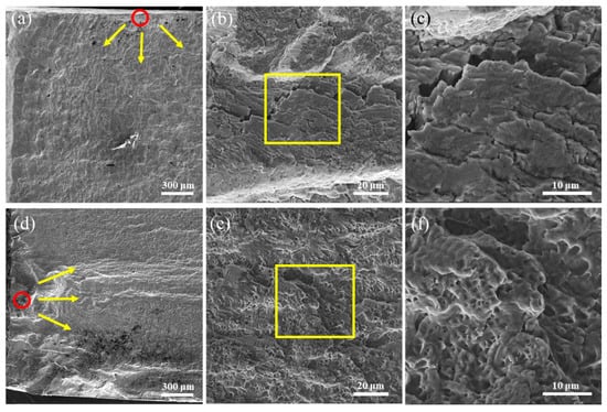 Figure 9 illustrates the fracture morphologies of the LDED alloy and LDED-UR alloy at different levels. The red circle in Figure 9a highlights the crack initiation site, while the yellow arrows show the direction of crack propagation. From Figure 9a, it is evident that the crack initiation site is located on the surface of the LDED alloy. In contrast, the LDED-UR alloy has a sub-surface crack initiation site, as illustrated in Figure 9d. This observation aligns with the findings reported in [48]. Meanwhile, this difference can be ascribed to the compression residual stress, which is introduced by surface cold working, i.e., in situ ultrasonic rolling. From Figure 9b,c and Figure 9e,f, it can be found that typical local fatigue striations appear in the fracture surfaces. For the LDED alloy, a pattern of flaky fracture can be discovered in the meso- and micrograph. Meanwhile, a pattern of flaky fracture (Figure 9e) transforming to the mixed brittle-ductile pattern (Figure 9f) can be found in the fatigue fracture morphologies of LDED-UR alloy. These results are consistent with the findings of Maruschak et al. [49]. It also can be concluded that the differences in the LDED and LDED-UR alloys are obviously at micro levels. The improved fatigue strength of the LDED-UR 316L stainless steel can be attributed to its low porosity and fine equiaxed grains. As illustrated in Figure 3, the fraction and size of pores in the LDED-UR alloy are significantly reduced via in situ ultrasonic rolling. Numerous studies [50,51] have highlighted that the fatigue strength is strongly correlated with the porosity characteristics of the additively manufactured alloy. Shrestha et al. [25] found that porosity serves as the precursor for fatigue crack initiation and significantly affects fatigue behavior. This phenomenon is primarily due to stress concentrations forming around micro-pores, which then leads to cracks forming under cyclic loading.