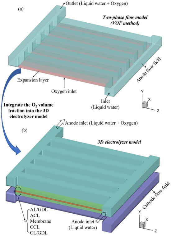 The former is widely implemented to evaluate the oxygen discharge characteristics, but it is time-consuming and cannot incorporate the other physics processes in other components. As a consequence, it cannot directly evaluate the electrochemical performance of a PEMWE. On the contrary, the latter 3D electrolyzer model neglects the two-phase flow dynamics (simplifying it as single-phase flow by neglecting the oxygen) in the flow field, which results in its underestimation of the influence of oxygen discharge on the PEMWE performance. To solve this issue, the oxygen volume fraction obtained through the two-phase flow model was implemented into the 3D electrolyzer model to accurately predict the PEMWE performance, and the details will be presented in the next section. This integration method originated from the fact that neglecting the oxygen in the anode flow field will result in the 3D electrolyzer model being unable to accurately predict the influence of the flow field structure on the electrolyzer performance, although the 3D electrolyzer model can predict the electrolyzer’s I-V curves under various operation conditions [21,22].