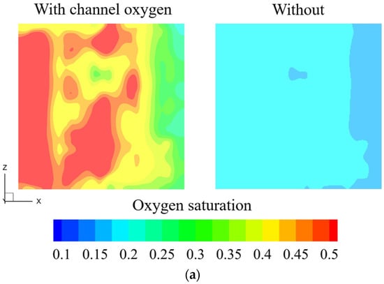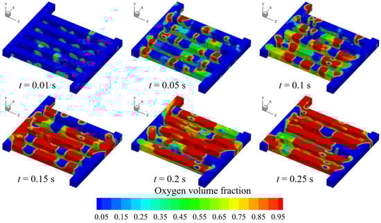 Clearly, the channel oxygen significantly worsens the uniform distribution characteristics. Specifically, the channel oxygen largely hinders the oxygen discharge from the CL and L/GDL into the channel, and the highest oxygen volume fraction area corresponds to the oxygen accumulation zone (i.e., the oxygen volume fraction distribution at t = 0.15 s in Figure 2).
