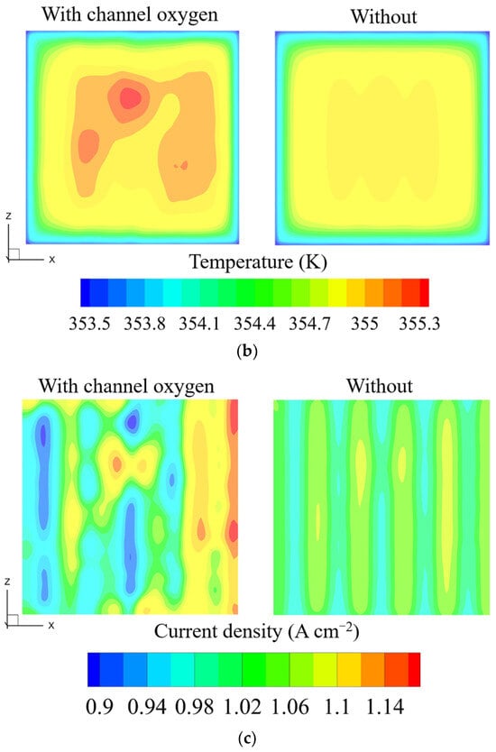 Furthermore, the non-uniform oxygen distribution induces the non-uniform temperature (in CL) and membrane’s current density distributions. In fact, the working voltage of the PEMWE increases from 0.77 V to 0.82 V considering the effect of channel oxygen. Consequently, it also contributes to the increase in temperature in the anode CL (Figure 3b). The simulation results presented in Figure 3 demonstrate that the influence of channel oxygen in the anode flow field is far from negligible [14,22]. It should be noted that the current (i.e., the product of current density and cross-sectional area) is constant (except in the CL component due to the electrochemical reactions) along the through-plane direction of the electrolyzer because these components are connected in series, but the local current density distribution is not identical as it is influenced by the local temperature, oxygen volume fraction, etc. Therefore, as seen in Figure 3c, the current density distribution in the simulation cases considering the oxygen in the channel is much more non-uniform than that without the channel oxygen, but the current and average current density (i.e., 1.0 A cm−2) is the same as the boundary value.
