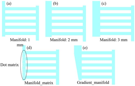 Schematic of the anode flow field with five different outlet manifold structures, (a–c): outlet manifold widths of 1, 2 and 3 mm, respectively; (d): inserting a dot matrix into the outlet manifold; (e): variable outlet manifold width gradually increasing from 1 mm to 2 mm.