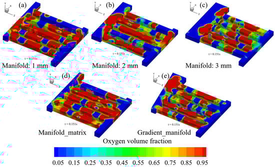 Oxygen amount distribution in flow fields with five different outlet manifold structures, (a–c): outlet manifold widths of 1, 2 and 3 mm, respectively; (d): inserting a dot matrix into the outlet manifold; (e): variable outlet manifold width gradually increasing from 1 mm to 2 mm.