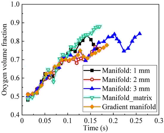 The figure shows that the oxygen volume fraction distribution characteristics do not show significant differences. However, increasing the outlet manifold width from 1 to 2 mm promotes the oxygen discharge in the channel region, but inserting a dot matrix into the outlet manifold zone blocks the oxygen discharge process. Moreover, the transient evolution of the average oxygen amount in the entire flow field presented in Figure 6 proves the findings. It should be noted that the channel two-phase flow does not have an absolutely steady state, and the oxygen volume fraction and corresponding distribution continuously vary even in the constant operation conditions. Even so, the simulation results shown in Figure 6 are sufficient to show the difference of these five structures in the oxygen discharge process, and the simulation results indicate that the variable outlet manifold width is not effective.