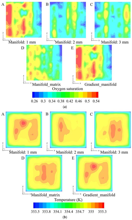 Figure 7 presents the distribution contours of the oxygen saturation, temperature (in CL) and membrane’s current density in the PEMWEs with five different outlet manifold structures.