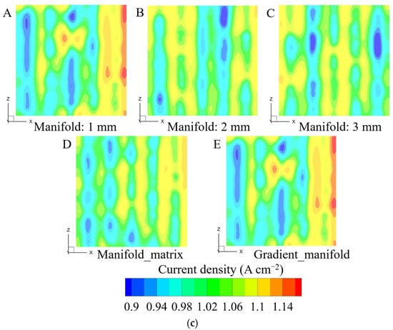 The figure shows that increasing the outlet manifold width promotes the uniform distribution characteristics. Furthermore, the outlet manifold width of 2 mm corresponds to the best PEMWE performance, as shown in Figure 8a, which is mainly a result of the PEMWE benefitting from the reduced oxygen concentration and concentration loss in anode CL, as presented in Figure 8b and Figure 8c, respectively.