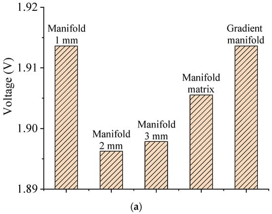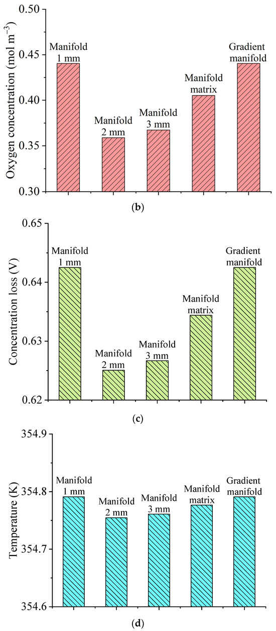 Additionally, taking the outlet manifold width of 1 mm as the base case, all these four cases with optimized outlet manifold structures improve the PEMWE performance to different extents due to lower concentration loss. And the improved PEMWE performance also accompanies a reduction in average temperature, as shown in Figure 8d, which is mainly because the lower operation voltage leads to a lower amount of waste heat being generated.