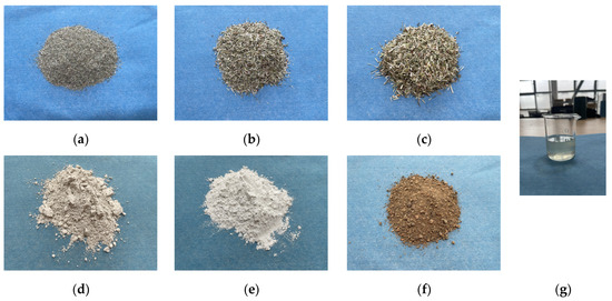 The additive used in this experiment is a concrete early strength agent. As shown in Figure 1g. Its main components include silicate, gypsum, and calcium oxide. These components can enhance the reactivity of the composite material and promote the hydration reaction. In the experiment, the amount of modified material additive was 18 g.