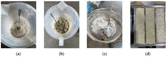 The preparation process for the grass fiber slag-based composite material is as follows: weigh the required amounts of alfalfa straw, slag, quicklime, sand, additive, and water for the specimen. (1) Weigh the grass fibers, slag, quicklime, and sand, and mix them evenly as shown in Figure 2a. (2) Add water in two stages: First, pour water into the mixture and continuously stir manually until all materials are thoroughly wetted, as shown in Figure 2b. Then, add the remaining water and start mixing with a mixer, as shown in Figure 2c, with a mixing time of 3 min. (3) After the mixture is uniform, add the additives and mix with the mixer for an additional minute. (4) Clean the sample molds. After cleaning and drying, apply a thin layer of mineral oil to the inner walls of the molds. Pour the mixture into the molds, which have dimensions of 40 × 40 × 160 mm. Level and compact the mixture with vibration as shown in Figure 2d. Prepare three samples for each group of tests. To prevent moisture evaporation, cover the samples with plastic film. (5) Allow the samples to set in the molds for two days. Then, de-mold the samples and place them in foam boxes in the laboratory for curing (at 20 °C ± 2 °C, 50% ± 5% RH) for 56 days. During the curing process, spray the blocks with water using a spray bottle every two days.