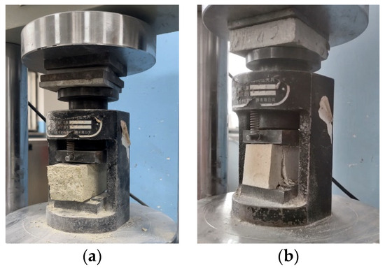 The compressive strength was determined using the central loading method described in the standard as per the Chinese national standard for test methods of mechanical properties of ordinary concrete (GB/T 50129-2011) [61] for testing the basic mechanical properties of masonry. An automatic cement flexural and compressive testing machine (DYH-300B, manufactured by Shandong Luda Testing Equipment Manufacturing Co., Ltd., Tai’an, China) was employed to test the mechanical properties of the specimens. The blocks obtained from the flexural tests (six per group) were used for the compressive strength tests. As shown in Figure 5a. Before placing the samples into the fixtures, the surface debris was removed. The sides of the specimens were used as the compression surfaces, and the loading speed was set to 1 kN/s. The specimen is subjected to a compressive load from the testing machine until failure occurs. As shown in Figure 5b. The average of the three test results was taken as the compressive strength.
