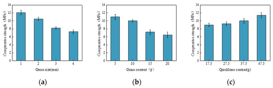 (a) Effect of grass size on compressive strength; (b) Effect of grass content on compressive strength; (c) Effect of quicklime content on compressive strength.