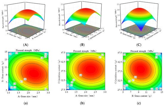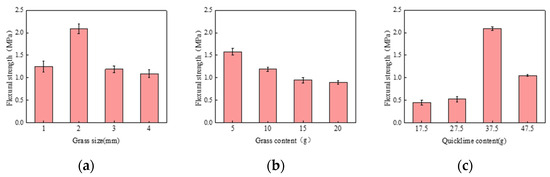 (a) Effect of grass size on flexural strength; (b) Effect of grass content on flexural strength; (c) Effect of quicklime content on flexural strength.