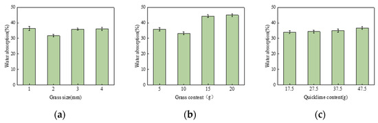 (a) Effect of grass size on water absorption rate; (b) Effect of grass content on water absorption rate; (c) Effect of quicklime content on water absorption rate.