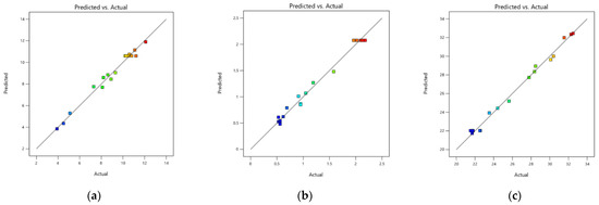 The optimum approach for confirming the relevance of the model is an analysis of variance (ANOVA), which was utilized to get the p-values for each model [65]. As shown in Table 5 through 7, the p-values of the regression models are all less than 0.0001, indicating that the regression models are statistically significant and highly significant. The p-values for the lack-of-fit terms (p = 0.2592 in Table 5, p = 0.1650 in Table 6, p = 0.3190 in Table 7) are all greater than 0.05, indicating that the lack-of-fit terms are not significant and the models have a good fit.