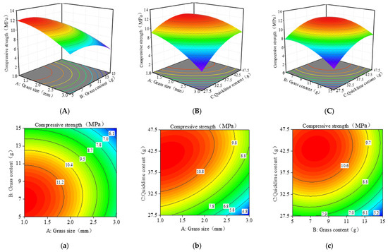 Using the Box-Behnken response surface optimization design, each factor in the Box-Behnken design method has three levels; each level is coded as (−1, 0, 1). The design matrix is centered at 0, with +1 and −1 representing the high and low values of the cube points, respectively. Through single-factor trials, appropriate ratios of grass content, grass size, and quicklime content were found for the experimental design. The statistical program Design Expert 10.0.3 was utilized in this investigation. Thirteen matching schemes and four repeat matching schemes were part of the experimental design, and the experimental variables were coded. The general form of the predictive polynomial equation is: