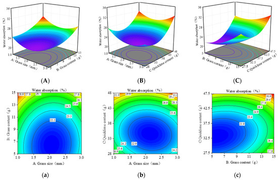 RSM is an optimization technique that measures a system’s reaction in relation to one or more variables. It employs graphical methods to illustrate functional correlations, enabling the selection of ideal circumstances for experimental design by intuitive observation [62,63]. RSM considers experimental random errors and fits complex, unknown functional relationships within a small region using a quadratic polynomial model to obtain continuous predictive models. These models allow for continuous evaluation at every stage of this study. Before using RSM, a single-factor experiment was conducted to study the effects of different proportions of three factors—grass content (5 g–15 g), grass size (1–3 mm), and quicklime content (27.5 g–47.5 g)—on the physical and mechanical properties of the composite material.