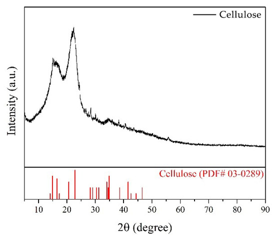 The dried grass powder was characterized using an X-ray diffractometer (model D8, Advance). Whenever the experimental material was sieved through a standard sieve with a mesh size of 70–80, 0.5 g of sample was added. The scanning range of the sample was set between 50° and 80°, with a scanning speed of 10°/min.