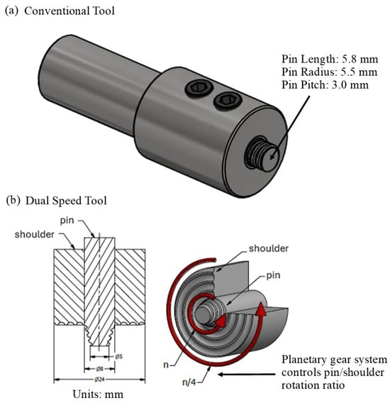 Schematic representations of (a) the conventional FSW tool and (b) the dual-speed FSW tool employed for this investigation.