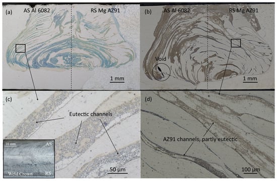 Weld microstructure at 710 RPM/90 mm/min: (a,c) ~0.6 mm offset towards aluminum alloy, (b,d) ~0.5 mm offset towards magnesium. Images (c,d) show higher magnifications of the eutectic channel layers (weld crown shown as inset to (c)) [].