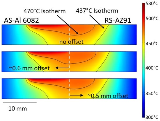 Simulation-based temperature distributions at 710 RPM/90 mm/min on a reference plane 6 mm behind the conventional tool for no offset, ~0.6 mm offset to Al 6082, and ~0.5 mm offset to AZ91 [].