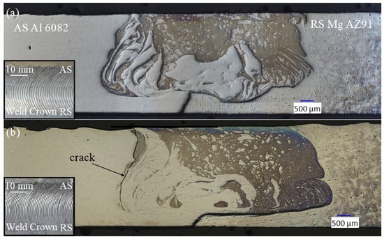 In the current study, tool offsets to AS (aluminum) and RS (magnesium) were considered. The weld microstructures in Figure 3 were all acquired at 710 RPM tool rotation and 90 mm/min weld speed []. The overall weld shape for which the root is wider than the surface aligns with the observations of Mehta et al. [] in their study of AZ31B/Al6061 friction stir welds in which “bulbous” shape welds were produced. As they noted, the flow of the aluminum alloy dominates the upper weld region, producing a trapezoidal shape in this area, while strong mixing of the alloys toward the root produces a wider weld region. The work by Chen et al. [], which investigated friction stir welding of the same alloys as Mehta et al., also substantiates this weld shape when they observed that strong vertical flow along the pin is reflected by the weld bottom, producing significant interleaving of the alloys in this region.