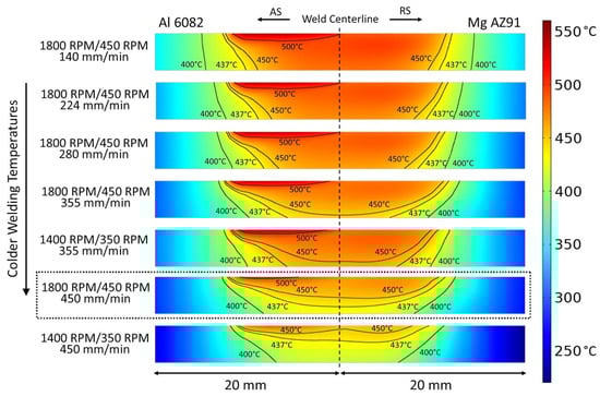 To elucidate the correlation between process parameters and weld quality, the temperature distributions predicted by the simulation on a reference plane (extending 20 mm from the weld centerline into both the AS and RS with a height equal to the workpiece thickness, i.e., 40 × 4 mm) 6 mm behind the pin were considered. These distributions are shown in Figure 6 for each of the seven process parameter combinations. The images are ordered according to the percentage of the cross-sectional area above the primary eutectic temperature of AZ91, 437 °C. Thus, the “hottest” weld, i.e., the weld achieving the highest percentage of the cross-sectional area above 437 °C, is at the top of the figure, with the “coldest” weld at the bottom of the figure. These percentages are shown in Table 3. It must be noted, of course, that these values depend on the size of the reference plane selected. For the dual-speed tool, the shoulder radius is 13.5 mm; therefore, the reference plane extends 6.5 mm into the advancing and retreating sides beyond the tool’s shoulder. The slowest weld speed for the dual-speed tool produced the highest heat input, and it is not surprising, therefore, that 75% of the planar cross-section is above 437 °C for the 1800/450/140 parameter set. As such, within the stir zone where mixing occurs, a significant amount of brittle Al12Mg17/α-Mg eutectic is produced under these conditions, which then promotes cracking in the fusion zone. As the percentage of the planar cross-section above the eutectic temperature decreases, the amount of brittle eutectic in the fusion zone also decreases, lowering the chances of weld zone cracks. One can infer, therefore, that a threshold value of the planar cross-section above Teutectic (as a measure of the heat input) exists above which a defect-free weld is unlikely due to the extent of and cracking of the eutectic structure but below which a defect-free weld is achievable. Indeed, at a cross-sectional percentage of 31%, a defect-free weld is produced under the 1800/450/450 conditions (italicized/bolded in Table 3 for emphasis).