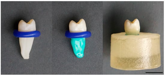 ETT premolar restored with occlusal direct resin composite filling. The enamel–cementum junction was covered by a ring of wax (left). Root surface was coated with A-silicon for simulating the biomechanical behavior of the periodontium (middle). ETT was embedded into transparent resin (right). Scale bar 1 cm.