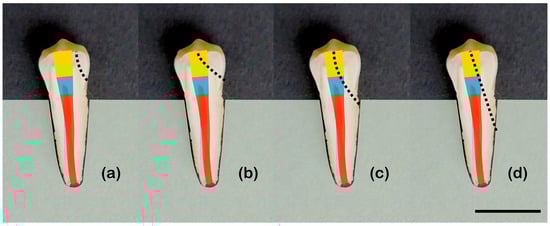 Fracture patterns. Endodontically treated premolars with root canal filling (red), glasionomer cement lining (blue) and direct resin composite restoration (gray). Dotted lines indicate fracture course: (a) fractures of the coronal tooth structure (grade 1); (b) fractures involving the coronal tooth structure and cohesive filling failure (grade 2); (c) fractures involving the tooth structure, cohesive and/or adhesive filling failure with root involvement (grade 3); and (d) severe crown and root fracture (catastrophic fracture, grade 4). Scale bar 1 cm.