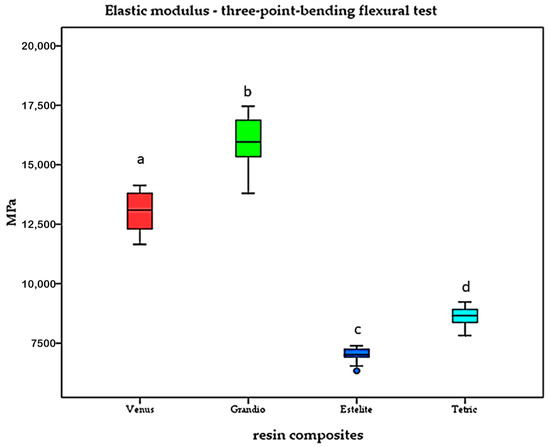 Elastic modulus of resin composites. Significance is marked by different letters (p < 0.05).