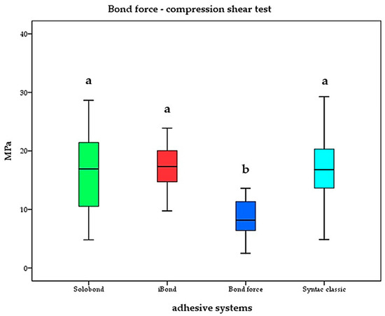 Shear bond strength of the applied adhesives. Significance is marked by different letters (p < 0.05).