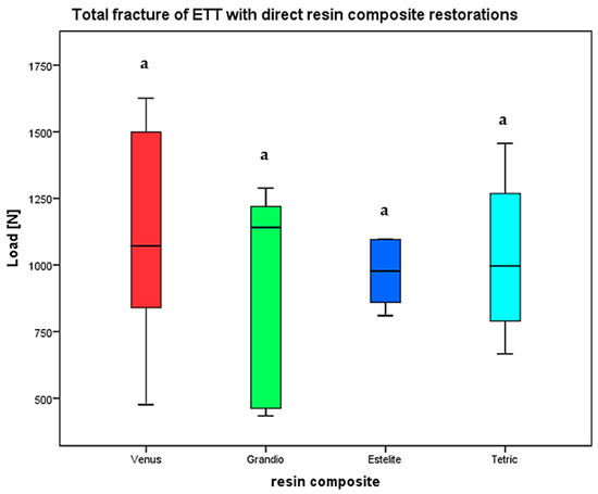 Fracture load (Fmax) of ETT with direct resin composite restorations. Significance is marked by different letters (p < 0.05).