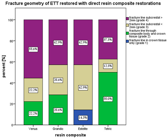 For ETT directly restored with Venus, Grandio and Estelite, the majority of fractures were of grade 4 which was the most unfavorable course (Figure 6). Grade 3 fractures were also commonly observed (Estelite 42.9%, Grandio 28.6%, Venus 22.2%), with the lowest proportion for Tetric Evoceram (12.5%).