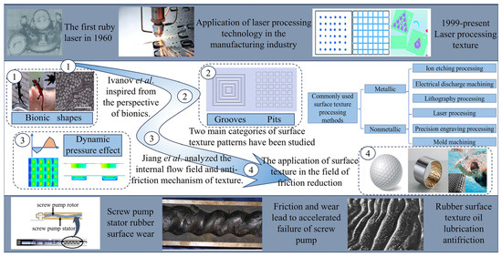 In 1960, Theodore Meyman invented the first ruby laser. Laser processing technology has been extensively researched and applied in various industrial fields [43,44,45,46]. Furthermore, compared with other surface machining technologies, laser processing offers high precision, fast rate, low environmental pollution, and affordability. In fields of tool surfaces [47], gears [48], plain bearings [49], cylinder liners [50], pistons [50], and mechanical seals [51], laser-machined surface textiles are often employed with lubricating fluids to reduce friction [52,53,54]. The tribological properties of these textures are significantly influenced by different operating conditions. Moreover, the quality of the lase-processed texture is significantly affected by the laser processing power parameters. For instance, Andersson et al. found that suitable laser-textured surfaces can reduce friction on steel surfaces [55]. Wu et al. obtained the appropriate laser energy and scanning rate to make the processed surface structure clear and complete [56]. Mao et al. found that scanning power and scanning speed affect the processing depth of surface texture. Roushan [57] demonstrated that using an appropriate high-energy laser beam and scanning frequency to prepare linear textures on the surface of a cemented friction pair could reduce wear during movement [58,59](Figure 1). Therefore, the selection of appropriate laser processing parameters is crucial for enhancing the quality of rubber surface textures. Finally, this study aimed to explore the influence of multilayer concentric hexagonal groove structure shape parameters on the rubber surface pressure field and flow state. Additionally, it investigated the optimal laser power processing parameter through experimental research to address the wear issues of rubber surfaces in electric submersible screw pump stators.