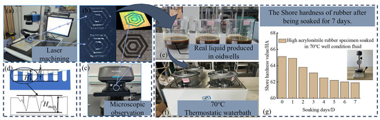 The nanosecond laser processing of rubber specimens was characterized by its simplicity and effective modeling, meeting the requirements for experimental processing. To simulate underground oil production conditions, the rubber specimen was soaked in the actual production liquid at 70 °C for 7 days (Figure 3e,f), ensuring the experimental results correlated with the actual application conditions. The variation of the average hardness values of the high-acrylonitrile rubber specimens utilized in the experiments is shown in Figure 3g. The hardness exhibited a decreasing trend, stabilizing after 7 days of immersion in the actual well-conditioned fluid at 70 °C, decreasing from 65.1 HA initially to 61.9 HA.