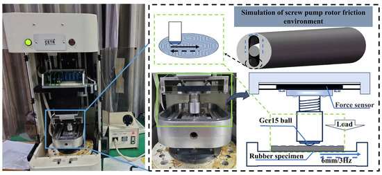Tribological tests were conducted on screw pump stator rubber with a textured surface after 7 days of immersion using a UMT-3 reciprocating friction and wear tester, U.S. CETR products, with the textured screw pump stator rubber specimen placed in the lower part and a 25 mm diameter Gar 15 bearing steel ball in the upper part of the specimen. The two specimens underwent relative sliding at a fixed frequency of 3 Hz (reciprocating distance of 6 mm). Friction experiments were conducted at a constant speed, with a load of 10 N applied under lubrication conditions to simulate actual well conditions in shale oil wells for 1200 s (Figure 4).