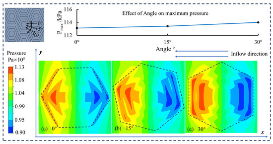 Influence of inflow direction ((a) 0°, (b) 15°, (c) 30°) on the dynamic pressure effect of multilayer hexagonal weaves.