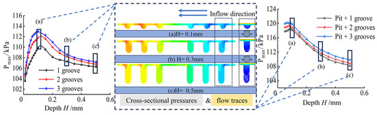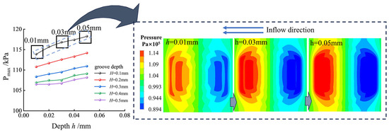 The addition of pit elements, equivalent in size to the outermost grooves, into the concentric hexagonal grooves of the multilayers enhances the pressure-bearing capacity of the texture to a certain extent. The depth of these pits resulted in different performances of the pressure-bearing capacity of the texture. Figure 7 shows the variation in the oil film pressure with pit depth for a hexagonal texture with pits and multilayer grooves. The presence of pits increased the oil film pressure across the texture, and the maximum oil film pressure of the composite hexagonal grooved texture increased with increasing pit depth.